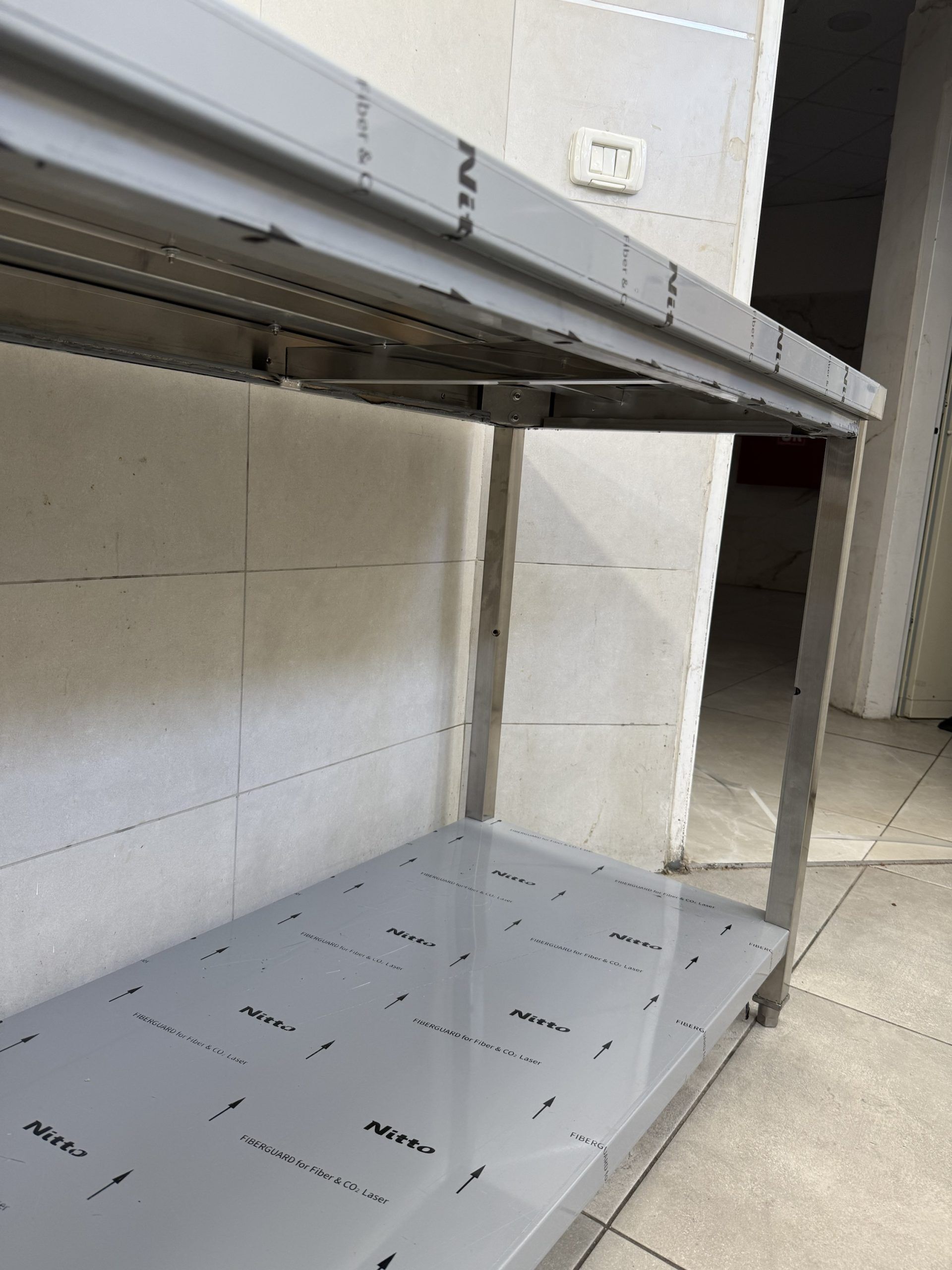 שולחן עבודה מנירוסטה סוג 201SS בעובי 1 מ"מ או 304SS עובי 1.2 מ"מ, עם שלדת תמיכה תחתונה ורגליים חזקות ליציבות מרבית. אידיאלי למטבחים מקצועיים,